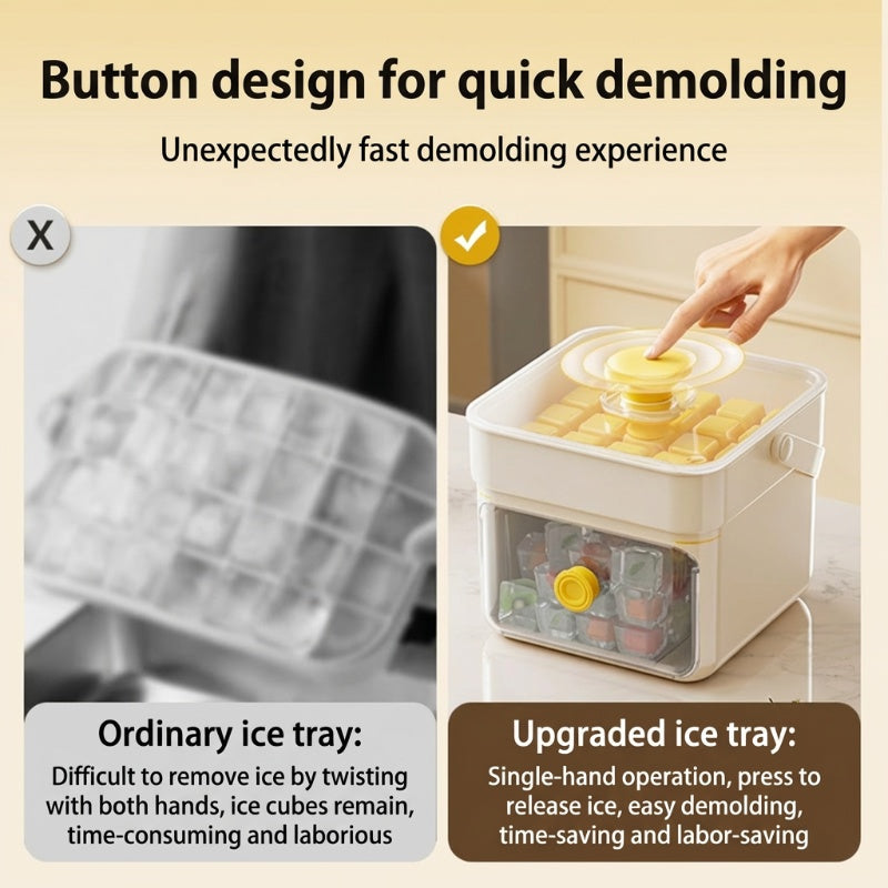 ИЗВАЖДАНЕ С ЕДНО НАТИСКАНЕ – Благодарение на иновативния дизайн на притискащата плоча всички кубчета лед могат да бъдат извадени само за една секунда. Просто обърнете формичката и натиснете надолу, за да извадите лесно и моментално кубчетата лед, без да се налага да въртите или да се навеждате.